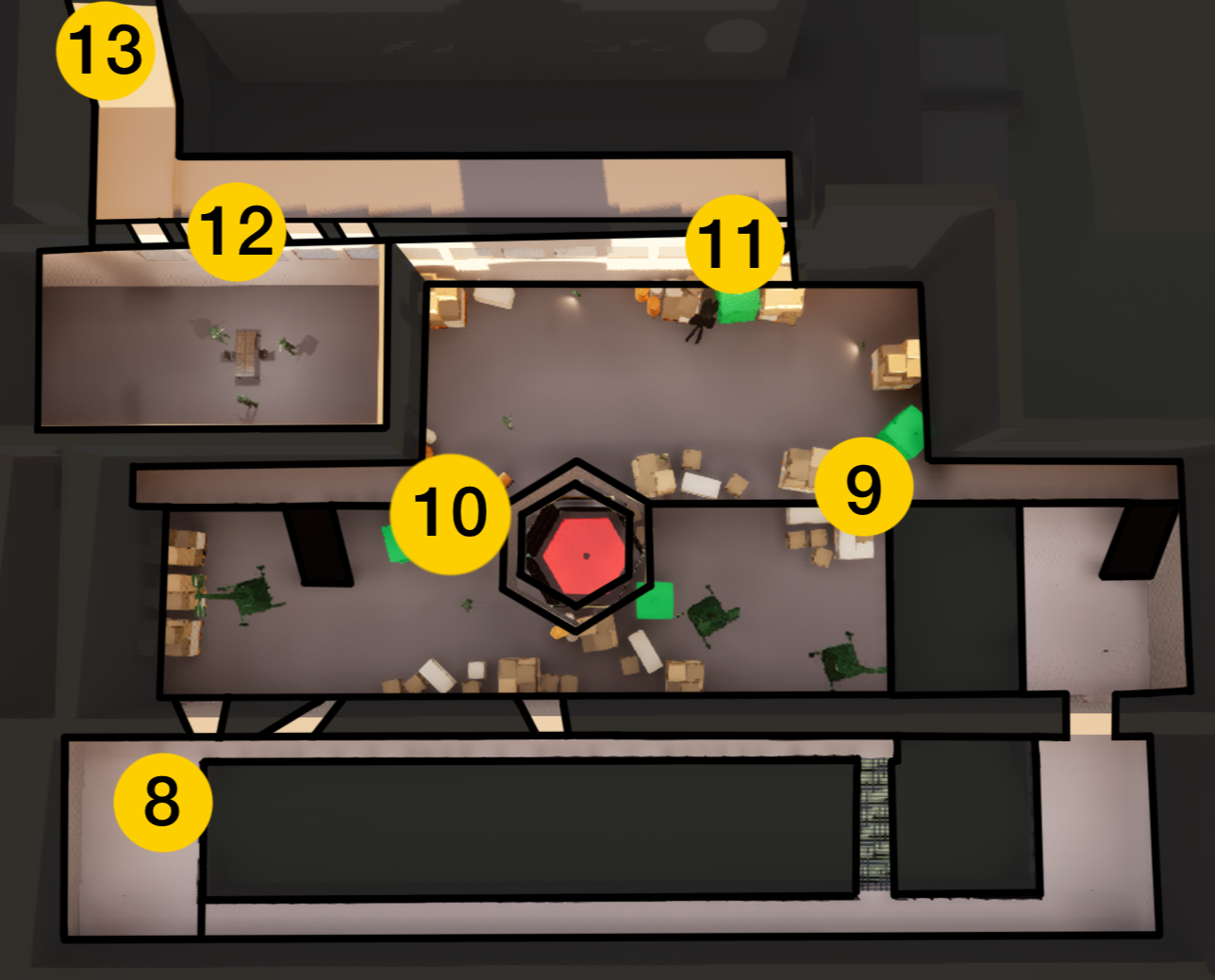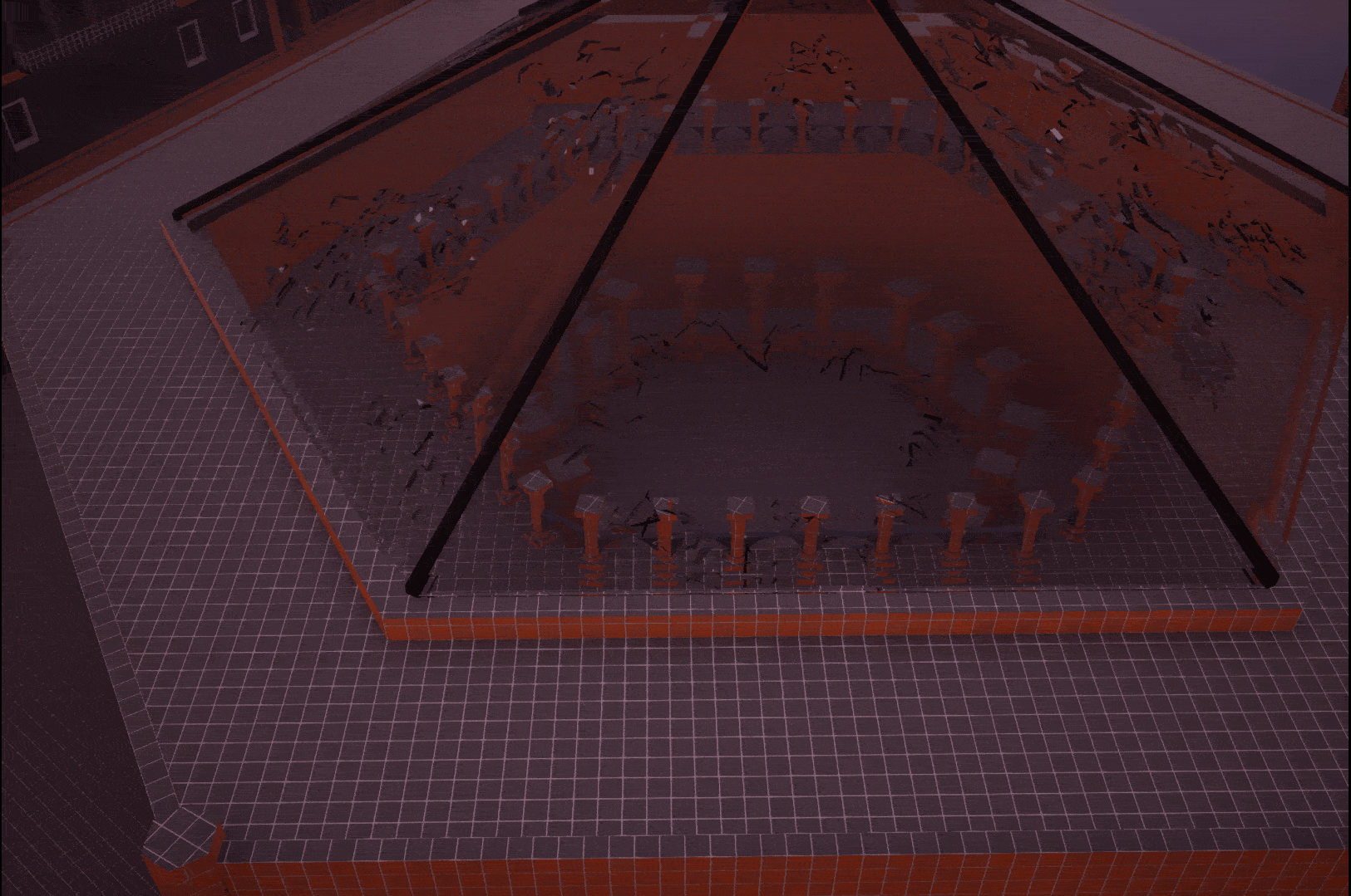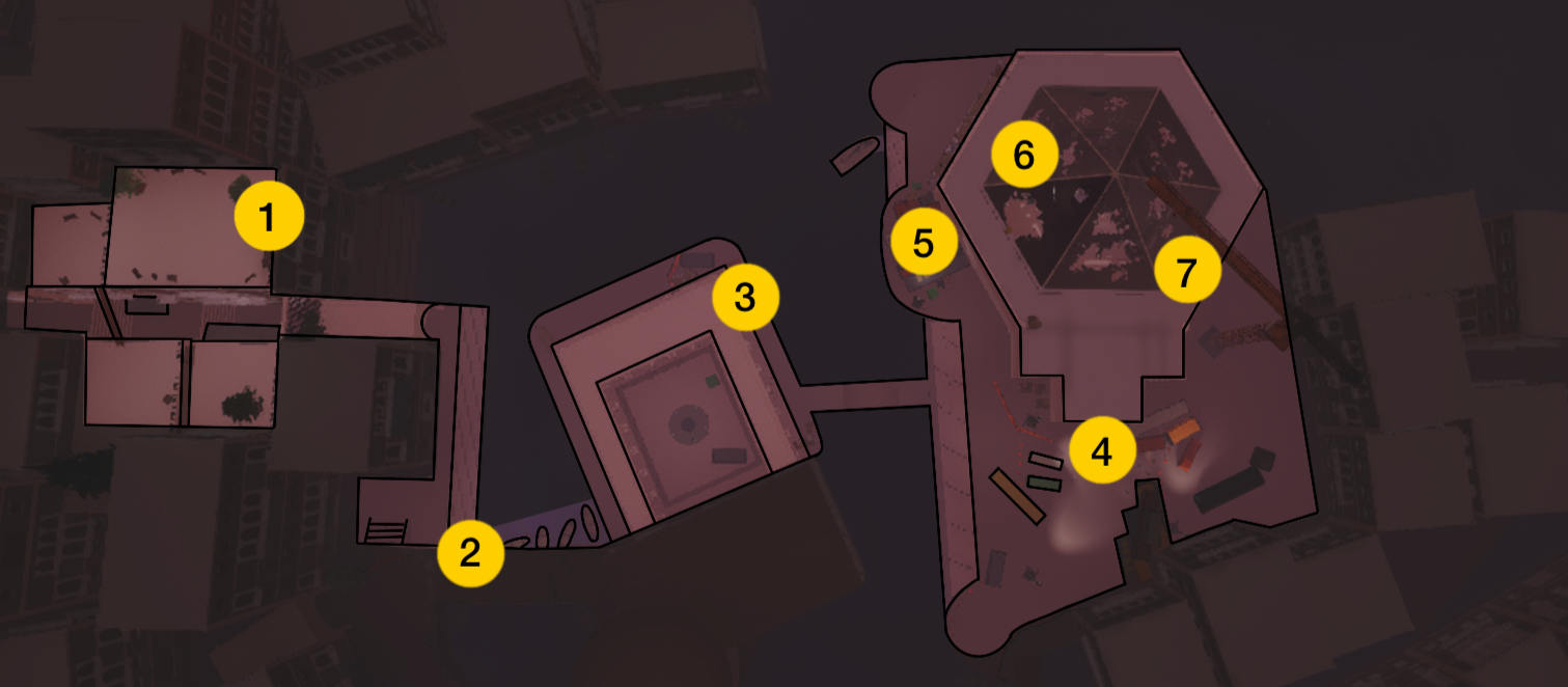 Reaching the top of the museum, the player encounters a dome like roof with cracked and broken glass, which serves as openings that indicate possible entry points.