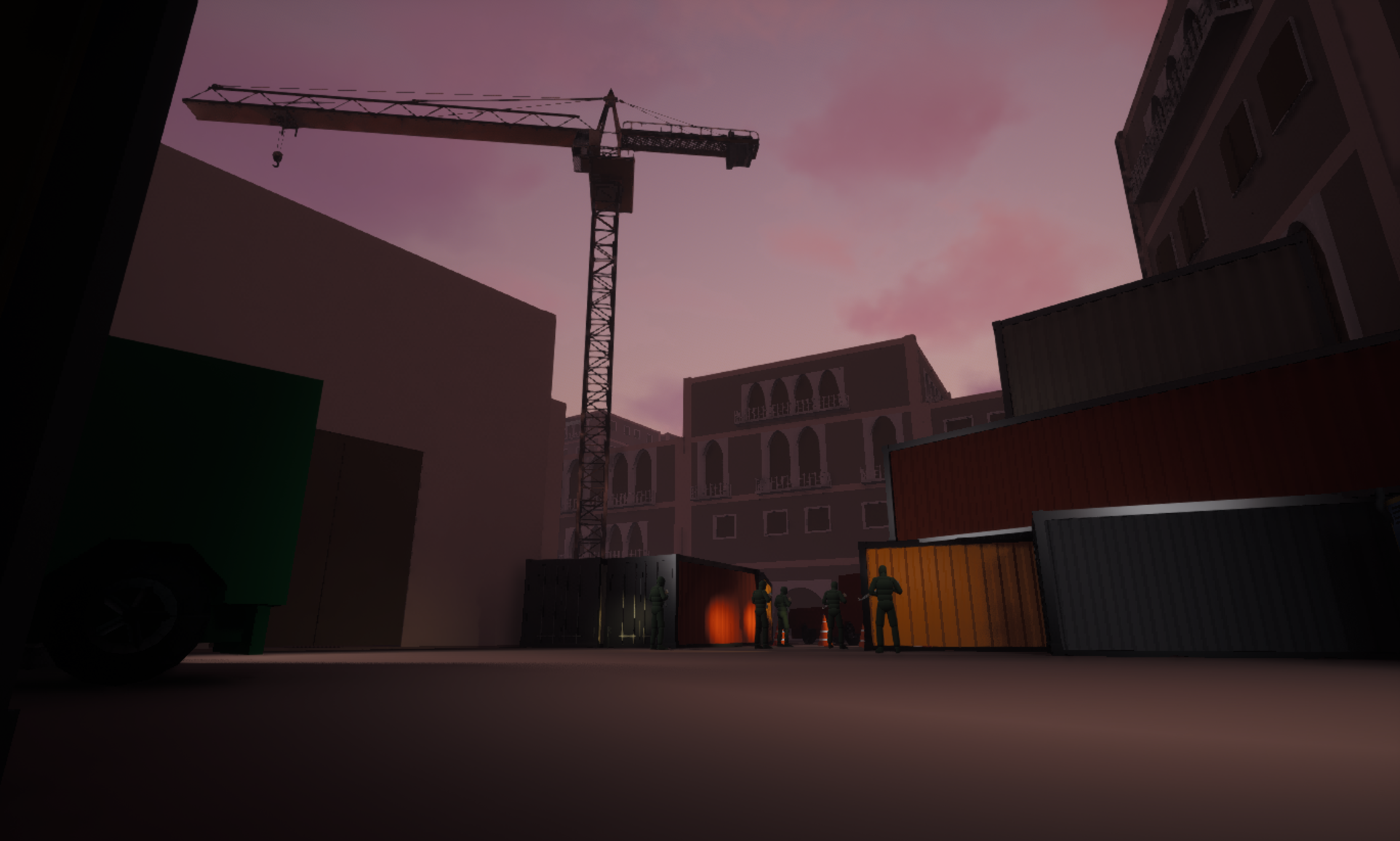 The level opens with an establishing shot of the above ground environment, presenting the full layout and drawing attention to the museum as a point of interest. This is achieved through careful placement of the sun and a tower crane to highlight and frame the museum.
