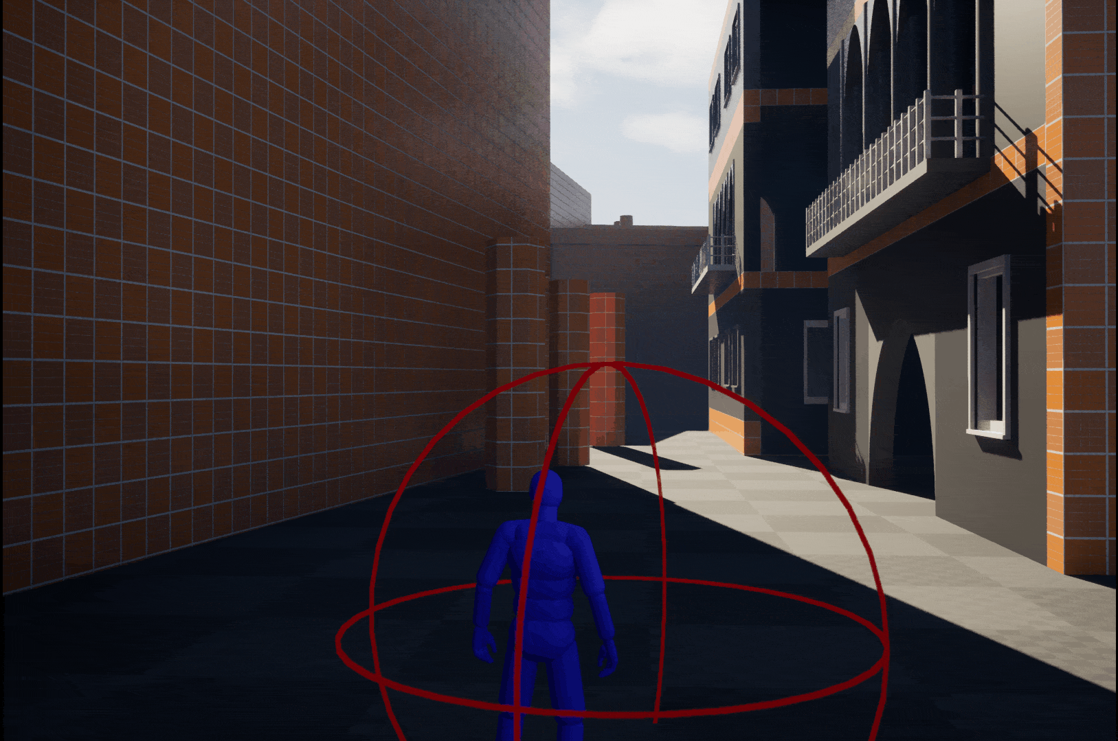 To support this process, I implemented a collision sphere on the player character, using it as a measurement tool to evaluate proportions and identify potential camera clipping issues. This ensured that the environment maintained a consistentscale in relation to the surrounding architecture.