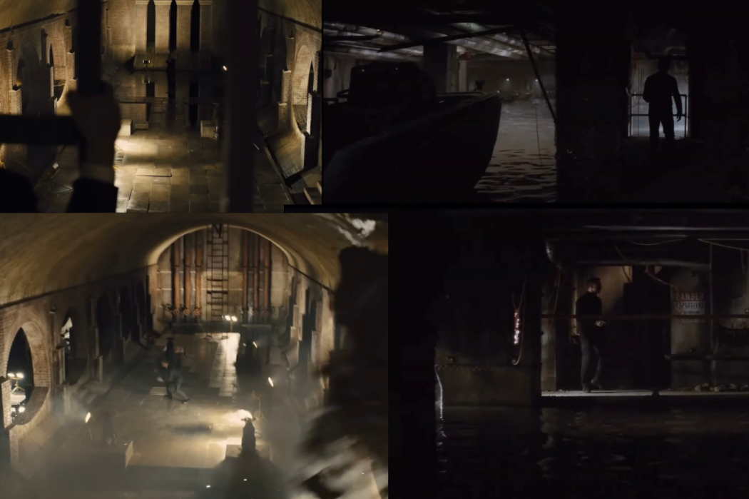 Upon arriving in the sewers, the player is confronted with a crumbling wall with large openings. Enemies positioned on the opposite side act as breadcrumbing elements, drawing the player’s attention forward.