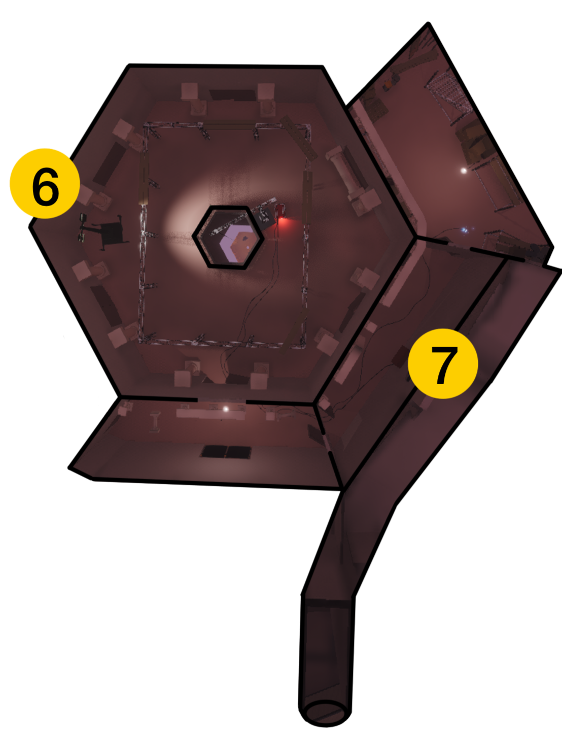 Moving through the second ventilation shaft, the player is guided by light filtering through grates, using lighting as a navigational cue. By approaching these light sources, the player is able to observe the secret meeting.